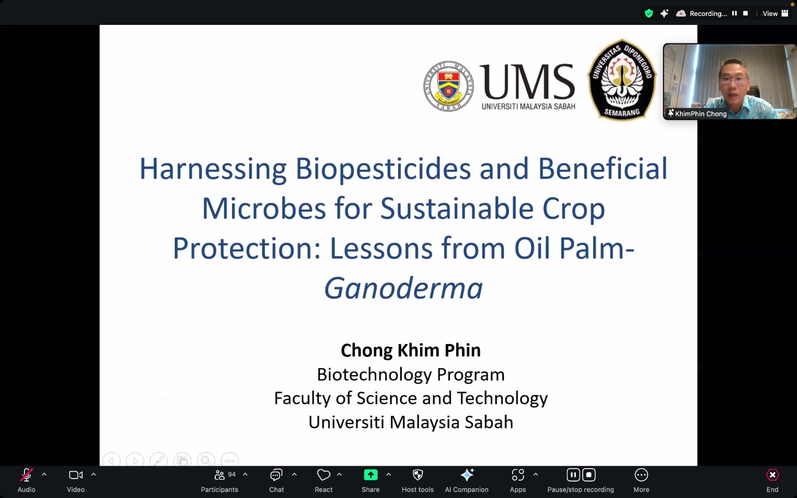 Kegiatan yang mengusung tema “Harnessing Biopesticides and Beneficial Microbes for Sustainable Crop Protection: Lessons from Oil Palm Ganoderma” ini dilaksanakan secara daring melalui Zoom pada Kamis, 2 Oktober 2025, pukul 14.30–16.30 WIB. Acara diselenggarakan secara terbuka untuk umum, dengan dibuka oleh opening speech dari ketua WCU Visiting Professor, Dr. Sri Pujiyanto, S.Si., M.Si. dan dimoderatori oleh Irfan Anwar Fauzan, S.Si., M.Si., dosen Program Studi Bioteknologi FSM UNDIP.