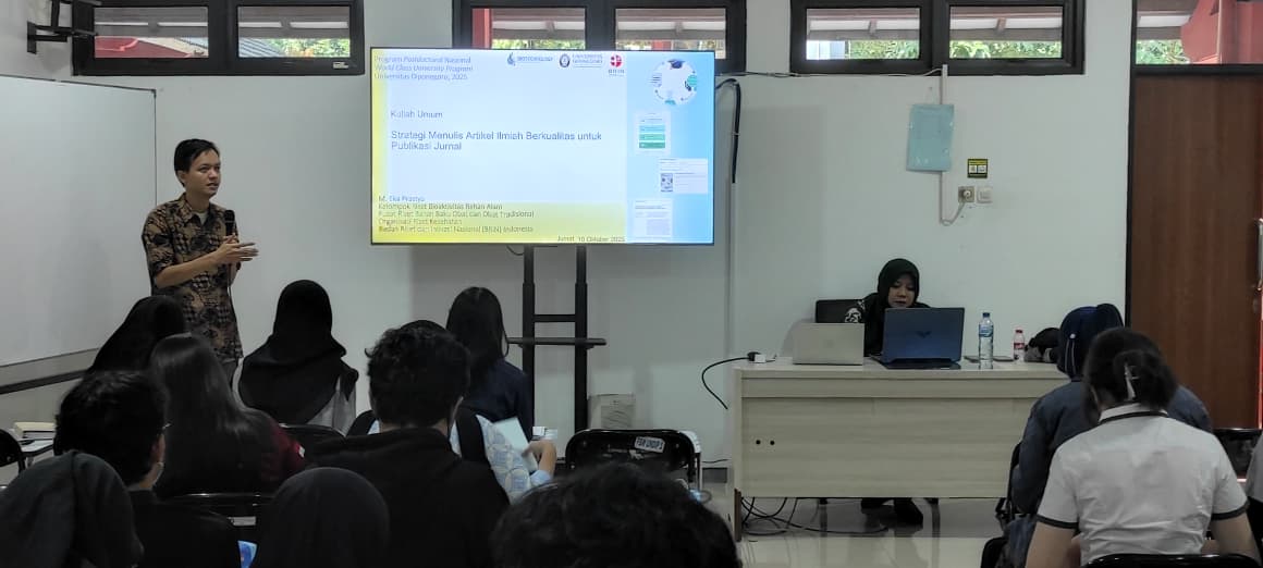 Program Studi S-1 Bioteknologi, Departemen Biologi, Fakultas Sains dan Matematika, Universitas Diponegoro, menyelenggarakan Kuliah Tamu Program WCU Postdoc Nasional pada mata kuliah Penulisan Karya Ilmiah pada Jumat, 10 Oktober 2025 di Ruang A204 Gedung A. Kegiatan ini menghadirkan narasumber Dr. M. Eka Prastya, S.Si., M.Si., peneliti dari BRIN Pusat Riset Bahan Baku Obat dan Obat Tradisional, serta penerima program WCU Postdoc Nasional. Kuliah tamu ini bertujuan memberikan pemahaman praktis mengenai strategi penulisan artikel ilmiah yang baik dan benar, sekaligus meningkatkan kompetensi mahasiswa dalam menyiapkan karya tulis akademik yang layak publikasi.