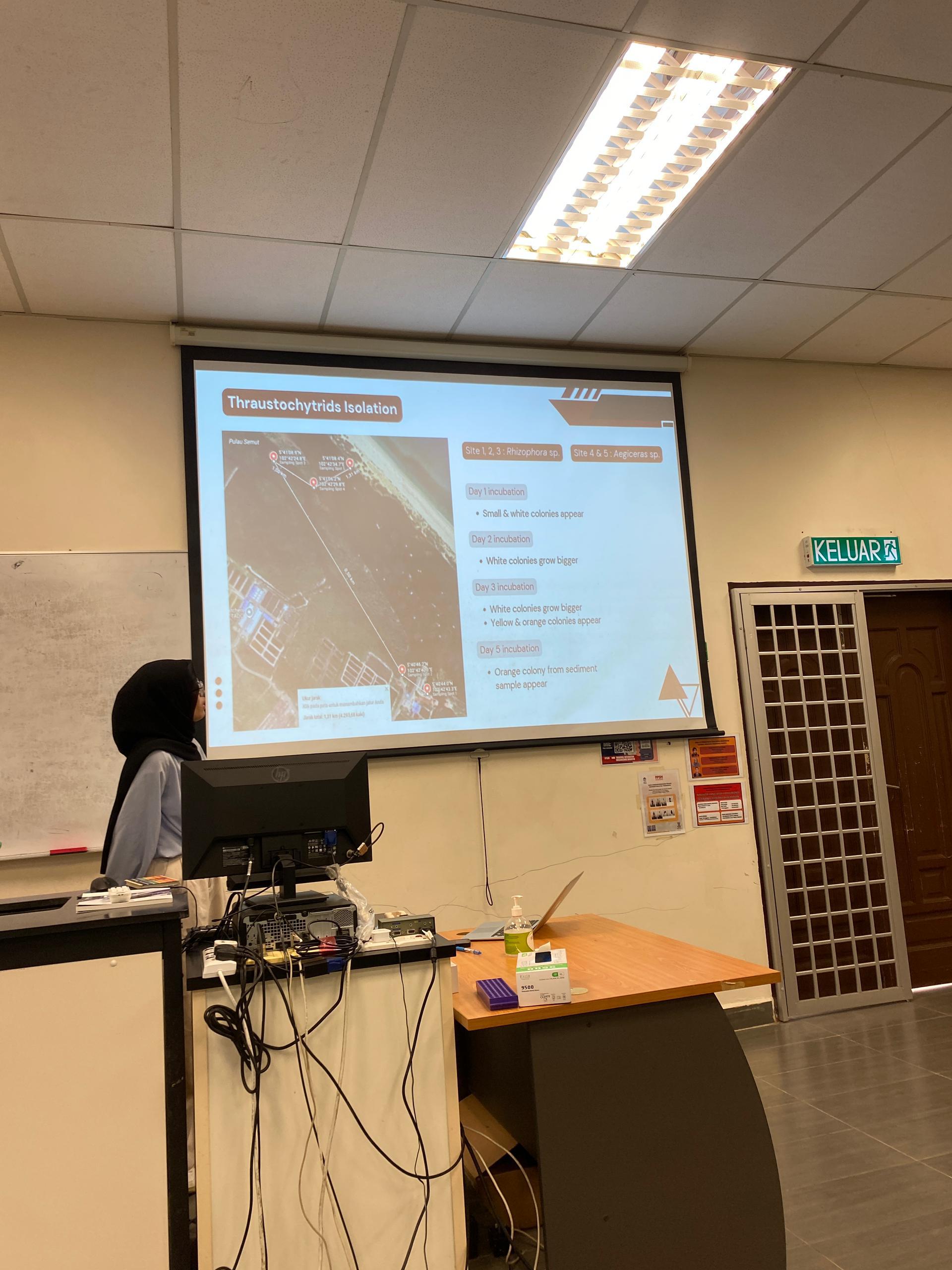 Her research focused on isolating and identifying Thraustochytrids, a group of marine heterotrophic protists with significant potential for biotechnological applications such as biofuel production, omega-3 fatty acids, and other high-value metabolites. Environmental samples were collected from the Setiu Wetlands, one of Malaysia’s most biodiverse mangrove ecosystems, known for its ecological richness and conservation importance.
