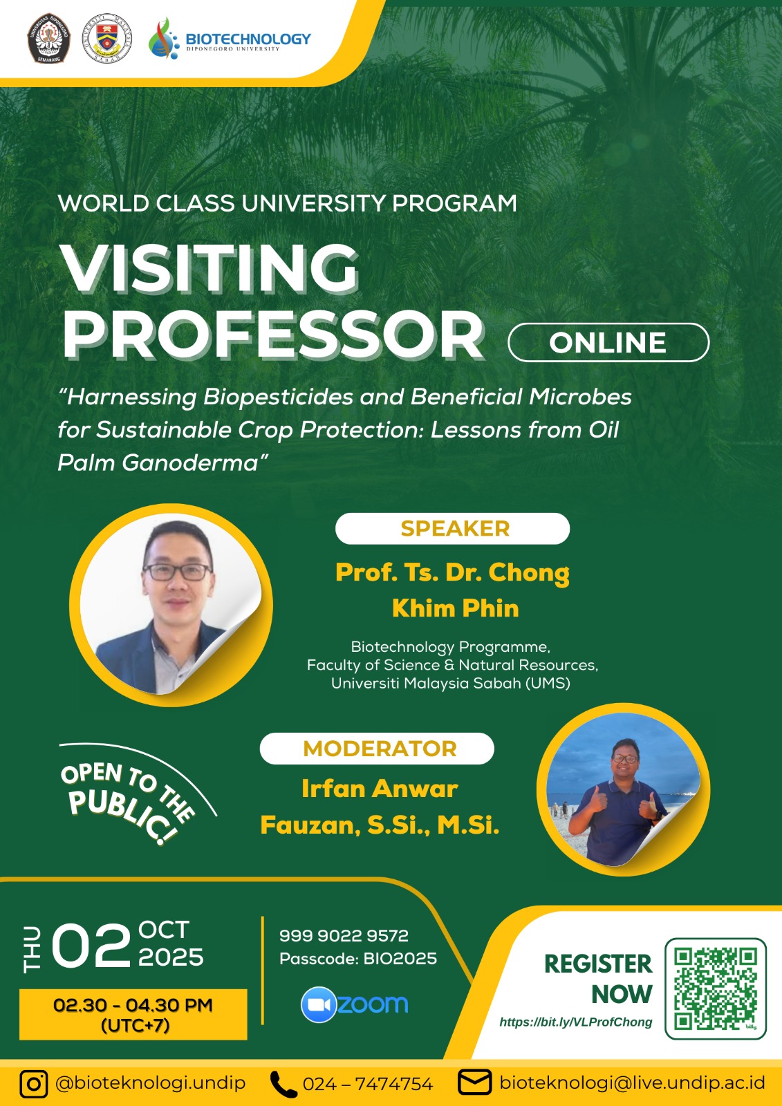 The event, themed “Harnessing Biopesticides and Beneficial Microbes for Sustainable Crop Protection: Lessons from Oil Palm Ganoderma,” was held online via Zoom on Thursday, October 2, 2025, from 2:30 to 4:30 PM (WIB). The open lecture began with an opening speech by Dr. Sri Pujiyanto, S.Si., M.Si., Chairperson of the WCU Visiting Professor Program, and was moderated by Irfan Anwar Fauzan, S.Si., M.Si., lecturer at the Biotechnology Study Program, Faculty of Science and Mathematics, UNDIP.