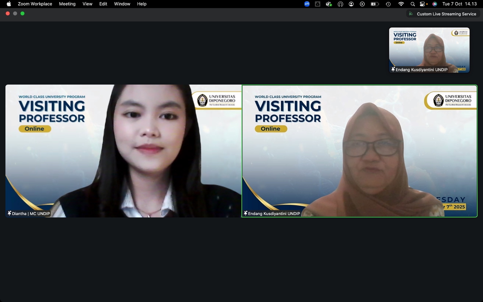 The session was held online via Zoom at 2:00 PM (WIB) and concluded with a Q&A session and closing remarks. Through this Visiting Professor Lecture, the Biotechnology Study Program of Diponegoro University reaffirmed its commitment to advancing biotechnology research and fostering sustainable innovation on a global scale.